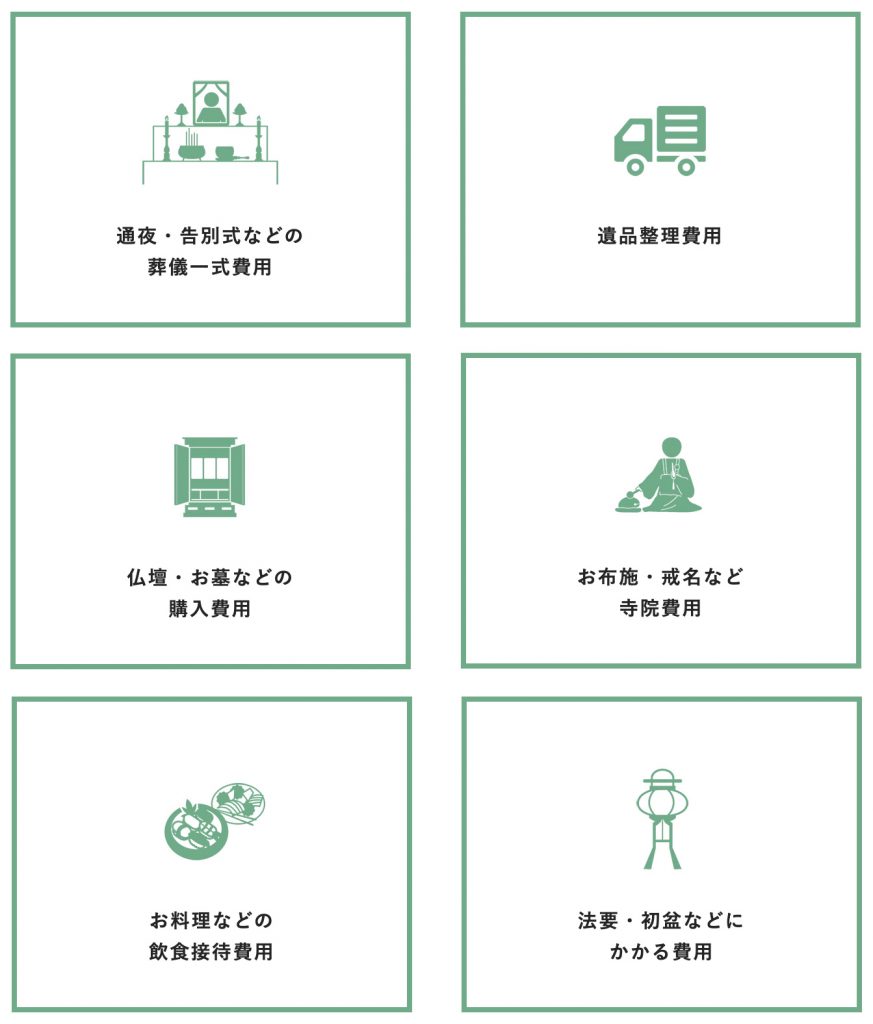 通夜・告別式などの葬儀一式費用、遺品整理費用、お布施・戒名など寺院費用、仏壇・お墓などの購入費用、お料理などの飲食接待費用、法要・初盆などにかかる費用