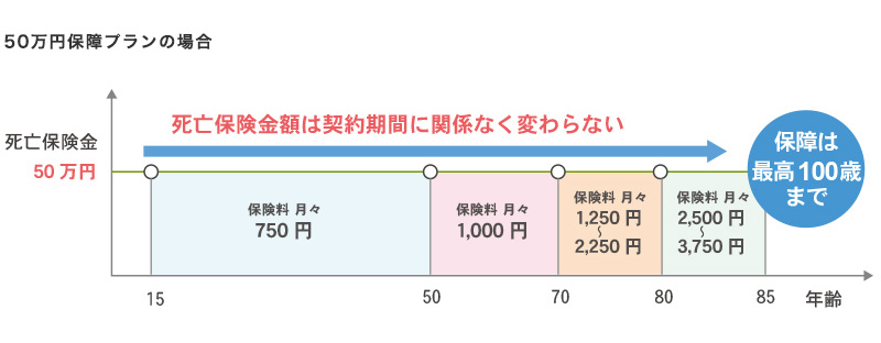 15歳~49歳の方は最安の月額750円から50万円の保障が可能です。
