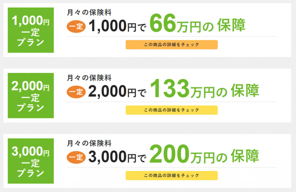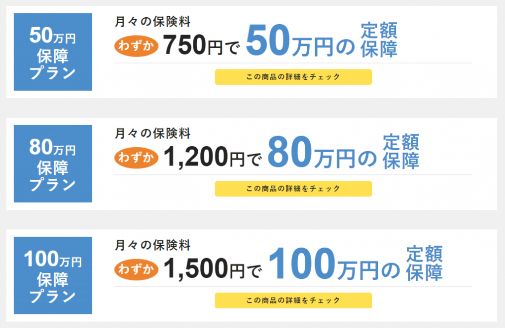 当社では50万円〜300万円までの保障を行う8プランの商品を準備しています。
