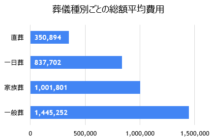 これは直葬の350,894円を大きく上回るものの、一般葬の1,445,252円、家族葬の1,001,801円に比べるとかなり抑えられており、費用面での負担が少ないことがわかります。