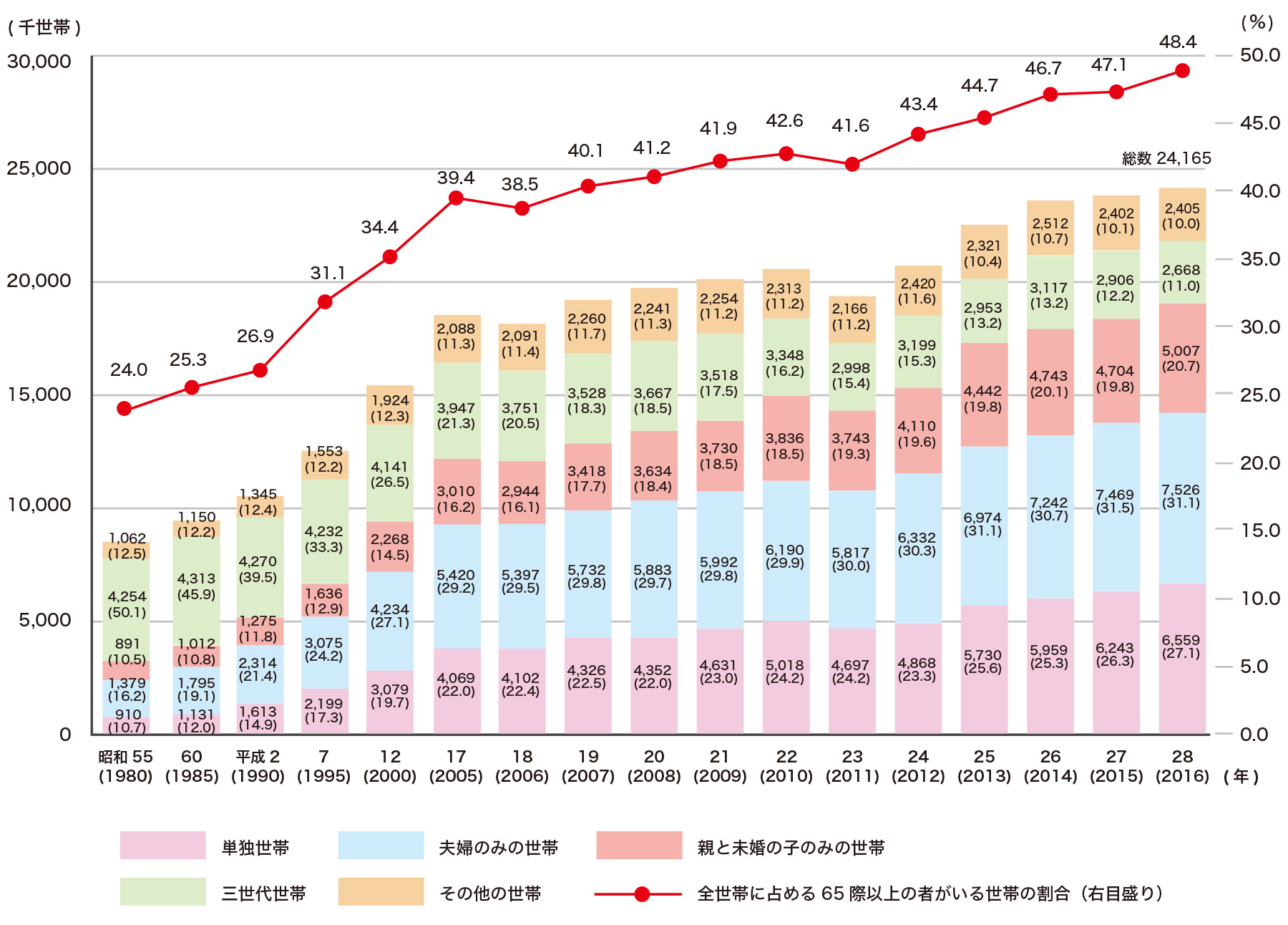 65歳以上の者のいる世帯についてみると、平成28(2016)年現在、世帯数は2416万5千世帯と、全世帯(4994万5千世帯)の48.4%を占めている。
