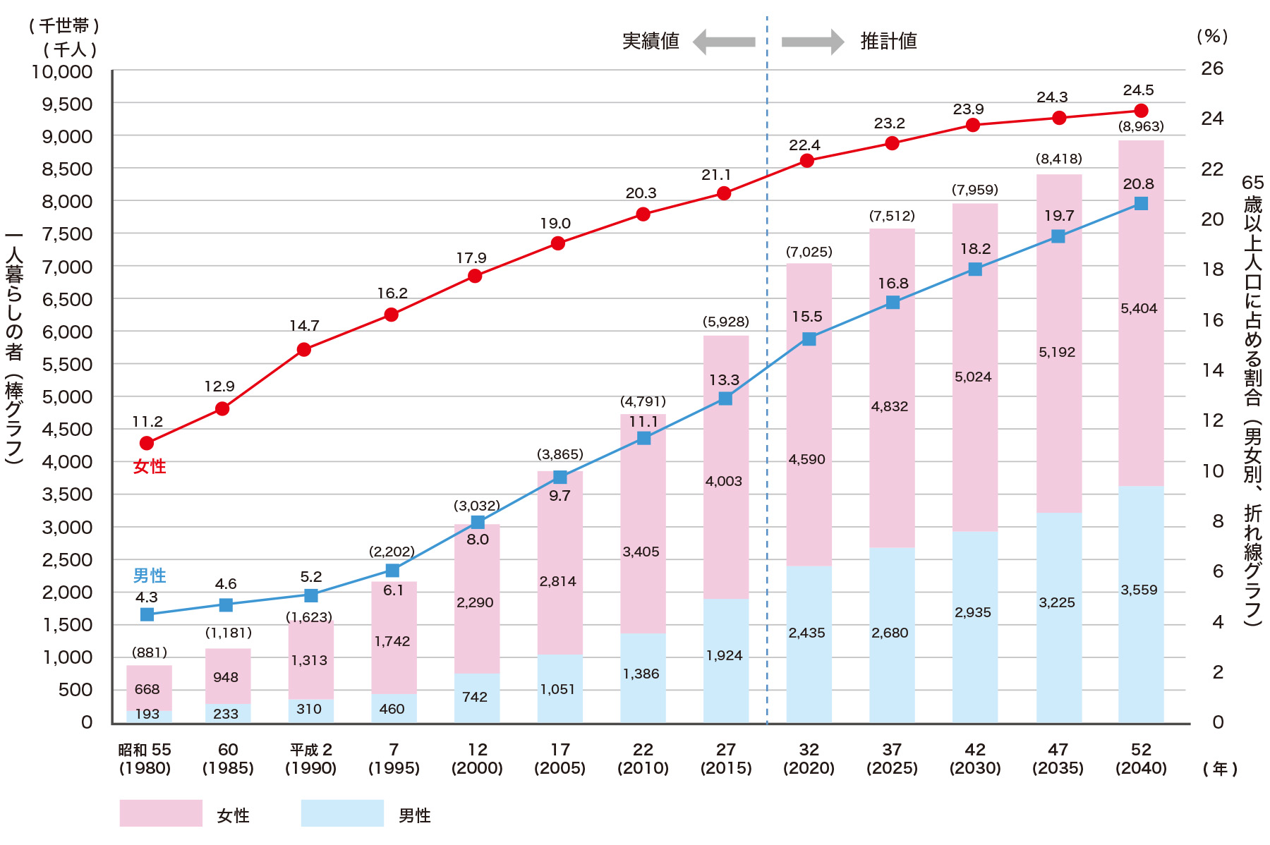 65歳以上の一人暮らしの者の増加は男女ともに顕著であり、昭和55(1980)年には男性約19万人、女性約69万人、65歳以上人口に占める割合は男性4.3%、女性11.2%であったが、平成27(2015)年には男性約192万人、女性約400万人、65歳以上人口に占める割合は男性13.3%、女性21.1%となっている。