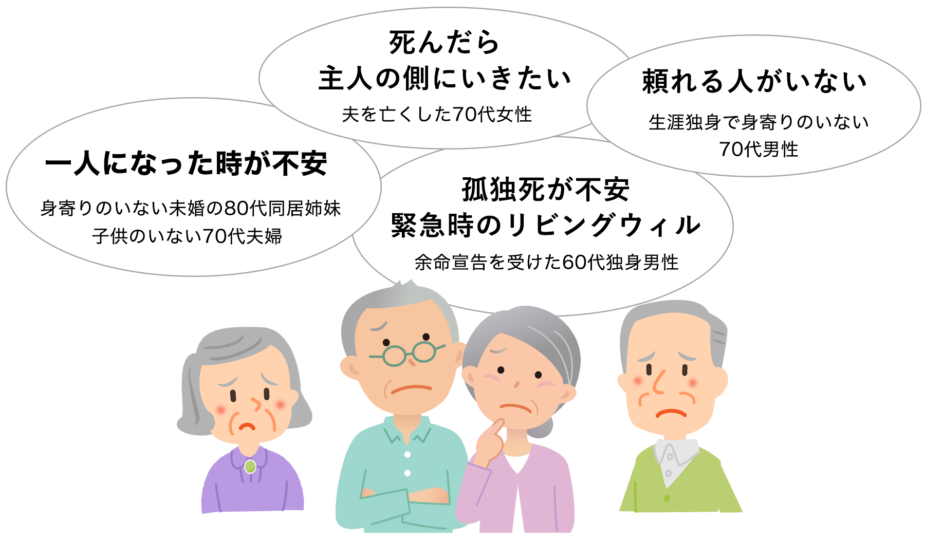 日本の超少子高齢化社会を展望しますと、これからの「終活分野」には葬儀やお墓、相続、高齢者の孤立等、人それぞれにさまざまな問題が予測され、その解決が求められています。