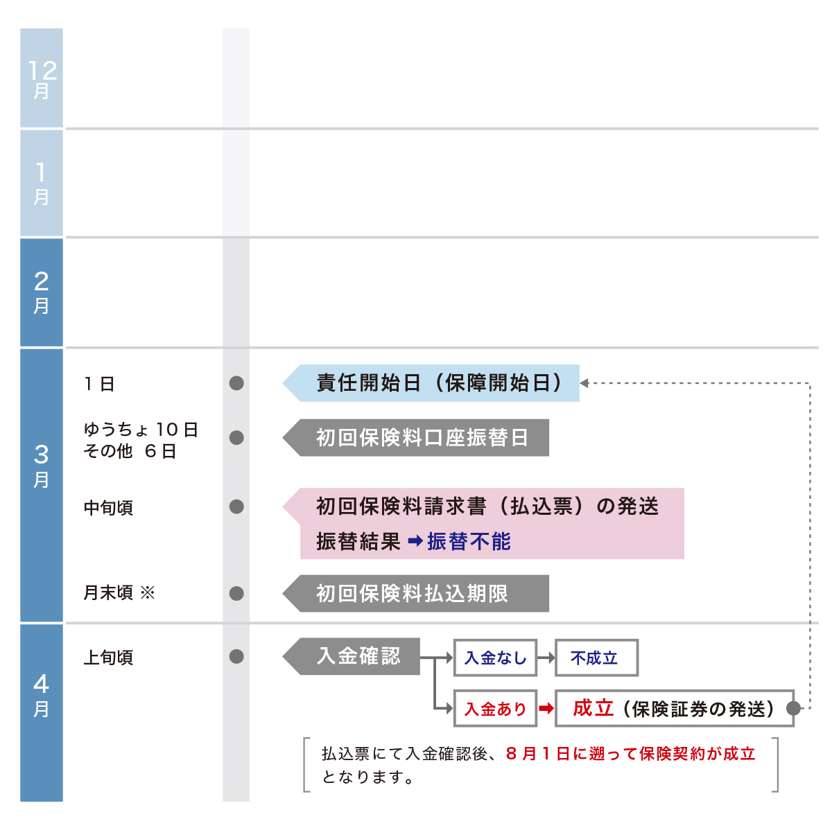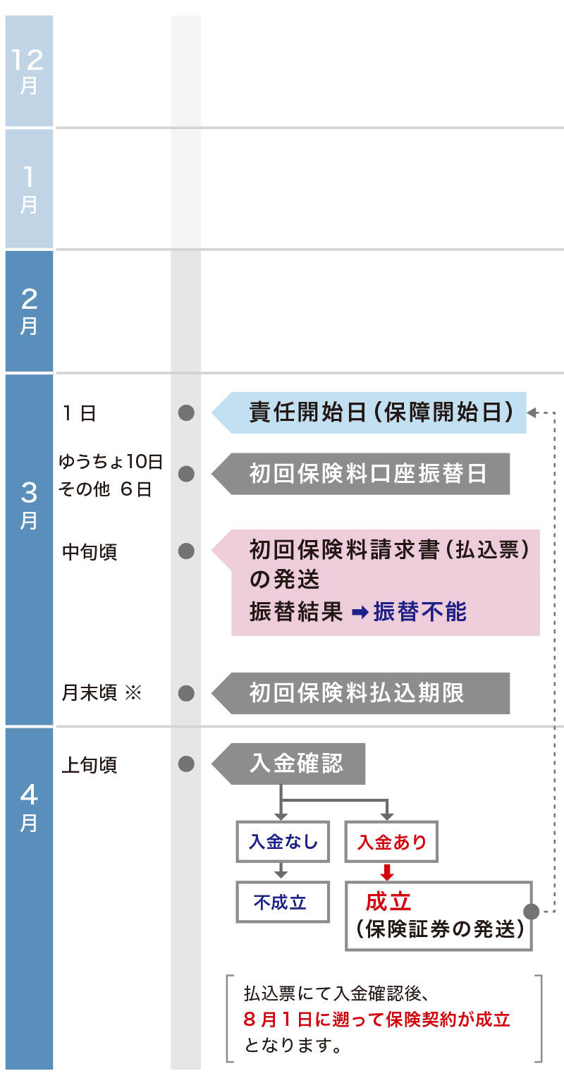 ※ 初回保険料の払込期限は当月末日ではなく、払込票に記載された期日となりますのでご注意ください。(27日前後となります)