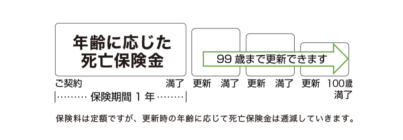 葬儀保険「千の風」の保険料一定タイプは、85歳10か月まで申込可能で、保険料は100歳まで定額ですが、更新時の年齢に応じて死亡保険金は逓減していきます。更新は99歳まで可能です。