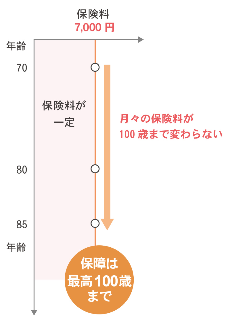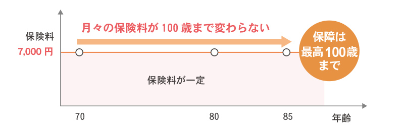 85歳10ヶ月まで申込可能で、年齢に応じて死亡保険金額は減額されますが、月々の保険料は7000円のまま100歳まで一定で、安心して続けられます。