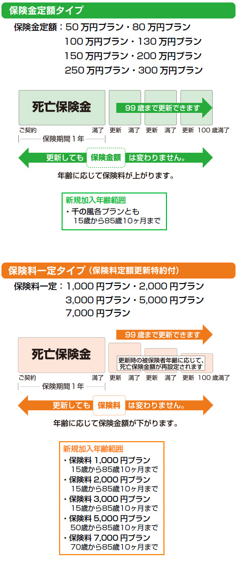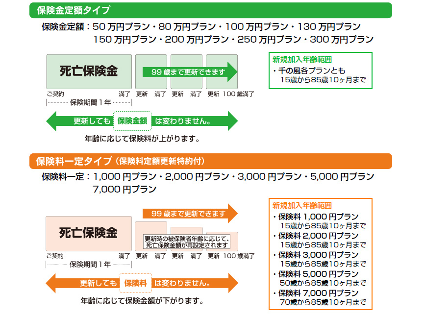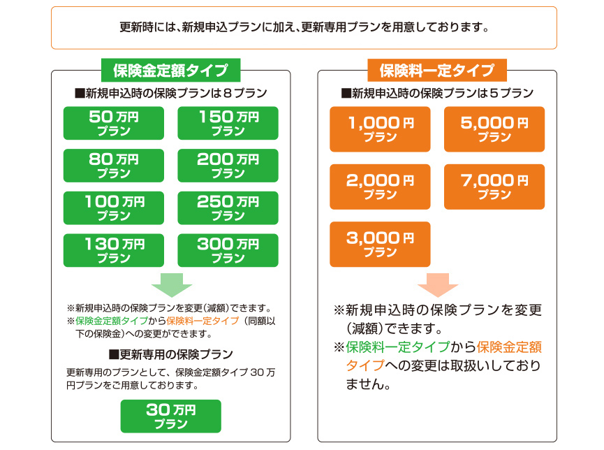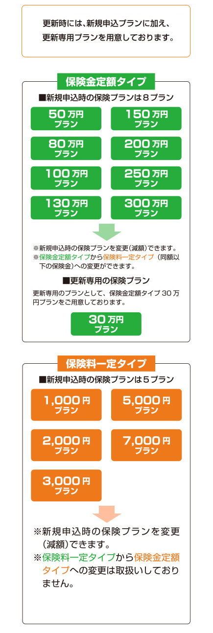この保険には、指定した保険料で更新後の保険金額を設定する、「保険料定額更新のための保険金額設定に関する特約 (略称 : 保険料定額更新特約)」を付加することができます。詳しくは当社フリーダイヤルへお問い合せください。