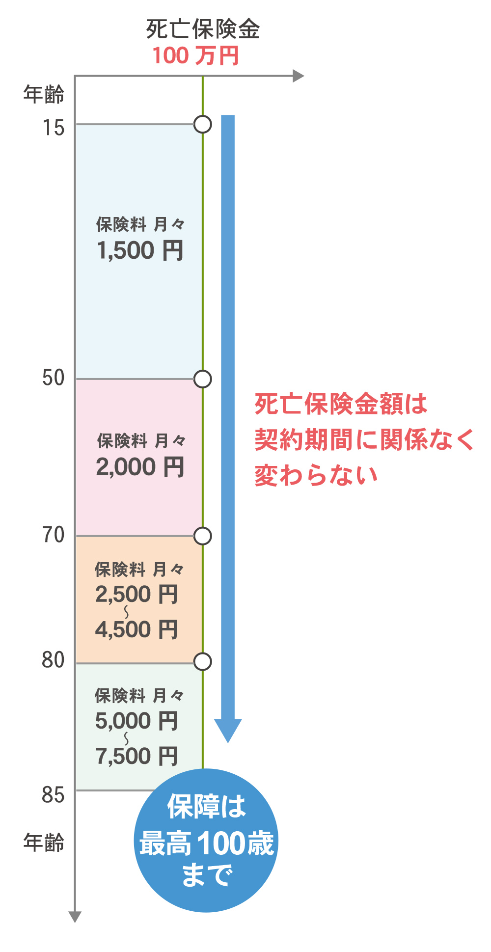 葬儀保険「千の風」の保険金定額タイプは、85歳10か月まで申込可能で、死亡保険金は契約期間に関係なく定額ですが、更新時の年齢に応じて保険料は逓増していきます。更新は99歳まで可能です。