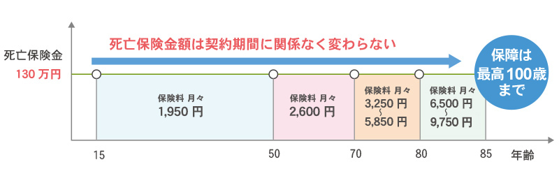 80歳未満の方は申込可能で、万一の時に保障される死亡保険金は、契約期間に関係なく変わらず、保険金130万円の保障が最高100歳まで続きます。