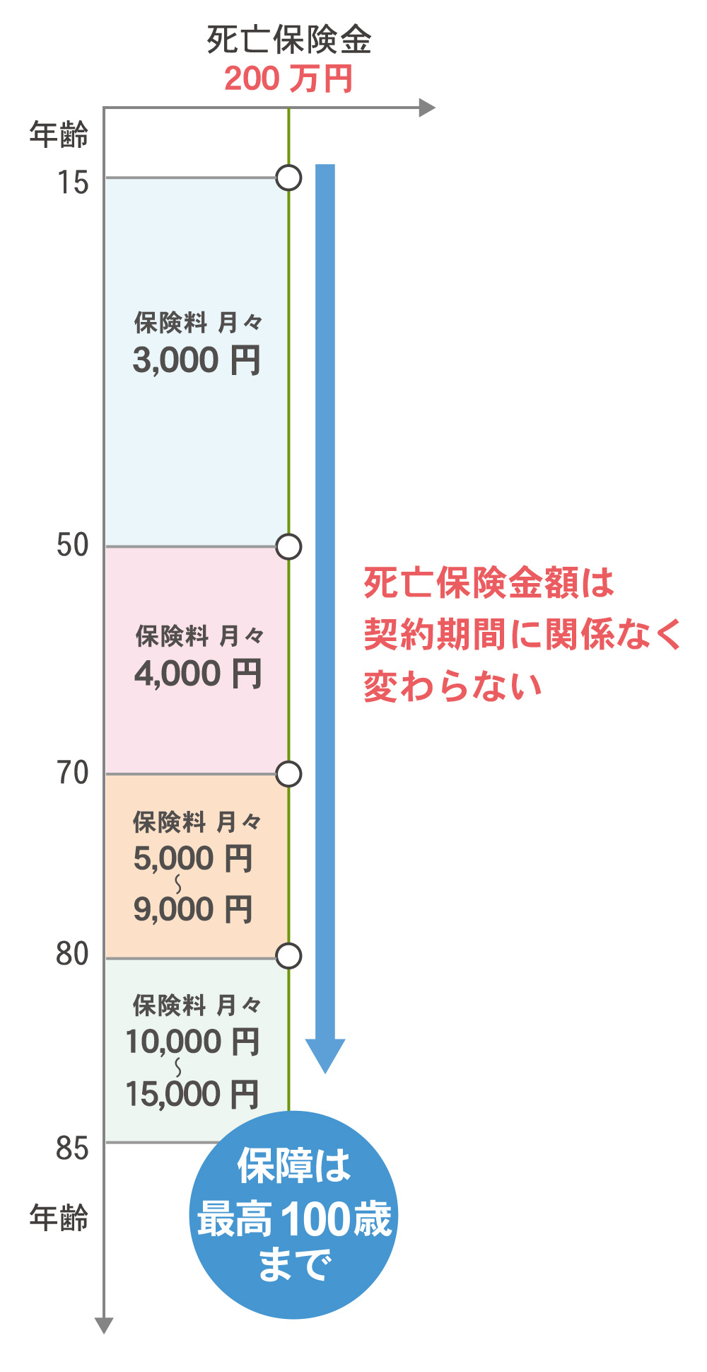 80歳未満の方は申込可能で、万一の時に保障される死亡保険金は、契約期間に関係なく変わらず、保険金300万円の保障が最高100歳まで続きます。