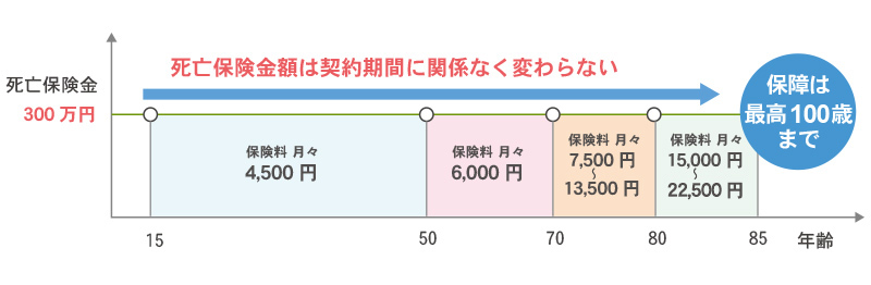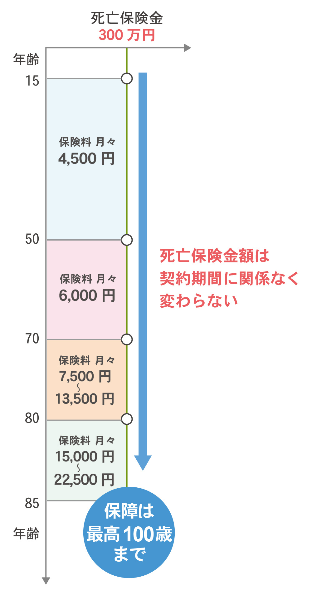 80歳未満の方は申込可能で、万一の時に保障される死亡保険金は、契約期間に関係なく変わらず、保険金300万円の保障が最高100歳まで続きます。